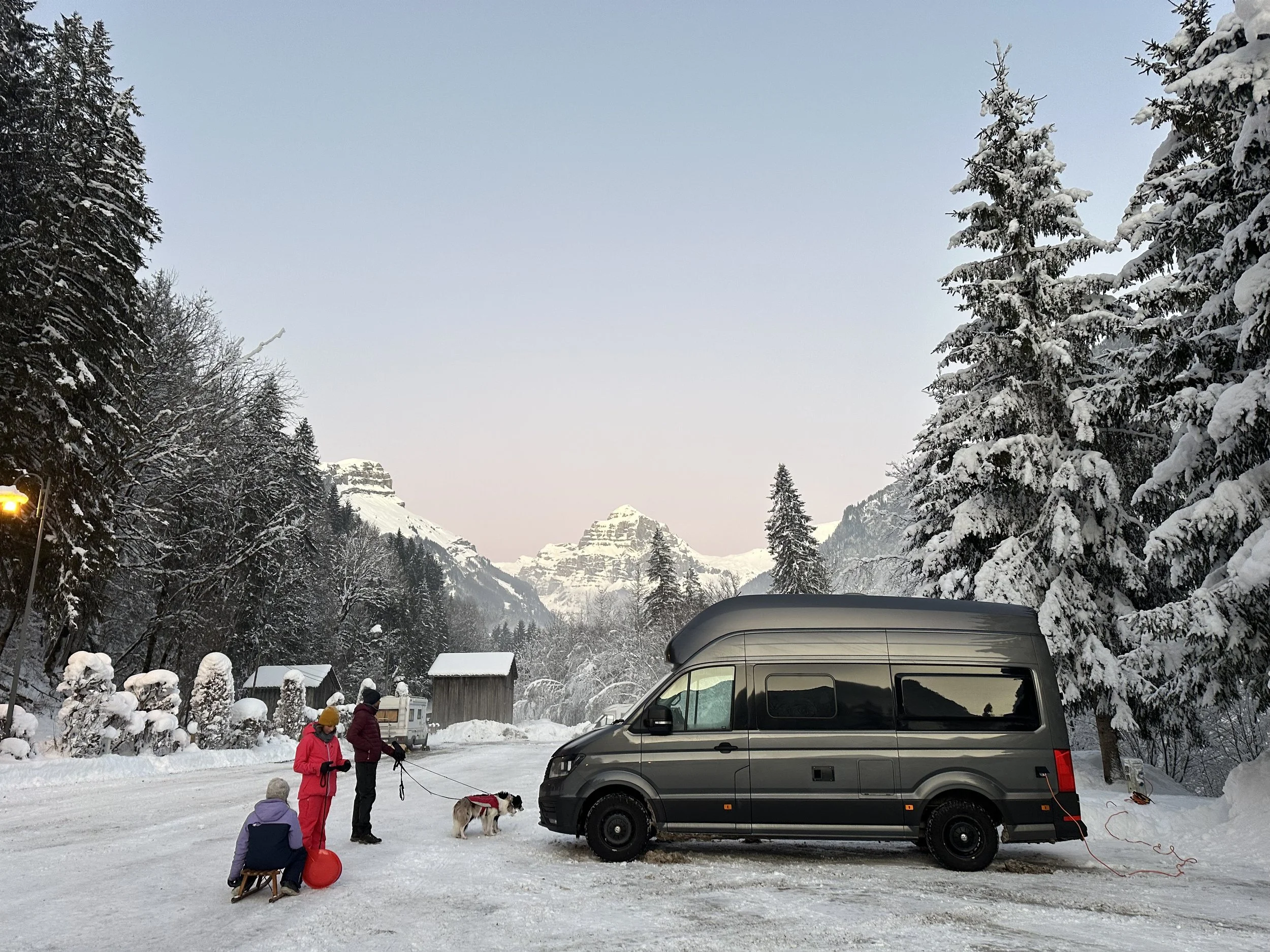 A winter family memory from our campervan — sledging in the mountains, returning to the warmth inside, and a quiet evening under the stars.
